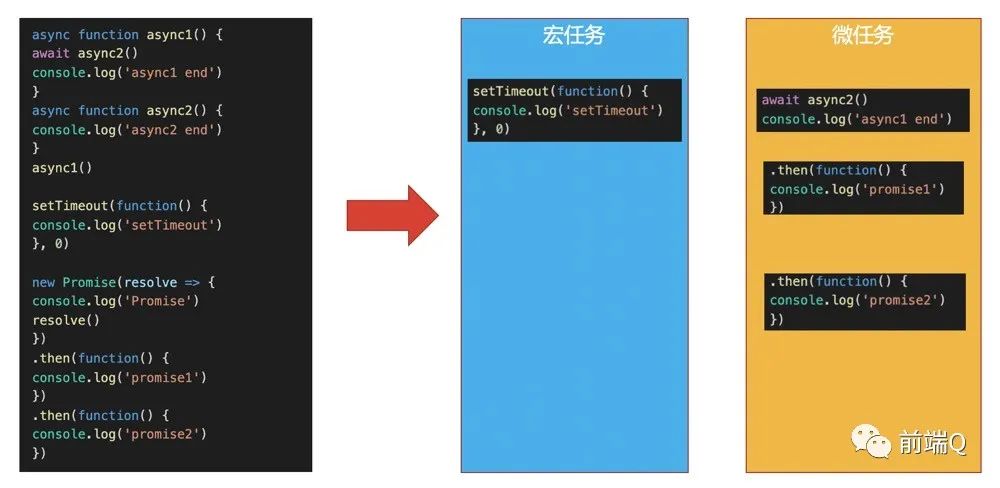 我们知道 async 隐式返回 Promise 函数,可以理解为 await 后的语句执行结束后,await 产生一个 micro-task。但是时机在与执行完 await 后的语句之后,会暂停当前执行,转而执行其他 loop。然后按照 micro-task 的注册顺序,继续执行。最后进入下一个 macro-task。